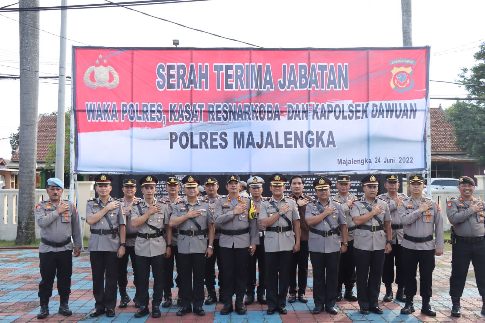 jejakkasus.co.id, MAJALENGKA – Kapolres Majalengka AKBP Edwin Affandi memimpin langsung Upacara Serah Terima Jabatan (Sertijab) Wakapolres, Kasat Reserse Narkoba dan Kapolsek Dawuan, bertempat di Halaman Apel Mapolres Majalengka, Polda Jawa Barat (Jabar), Jumat (24/6/2022).