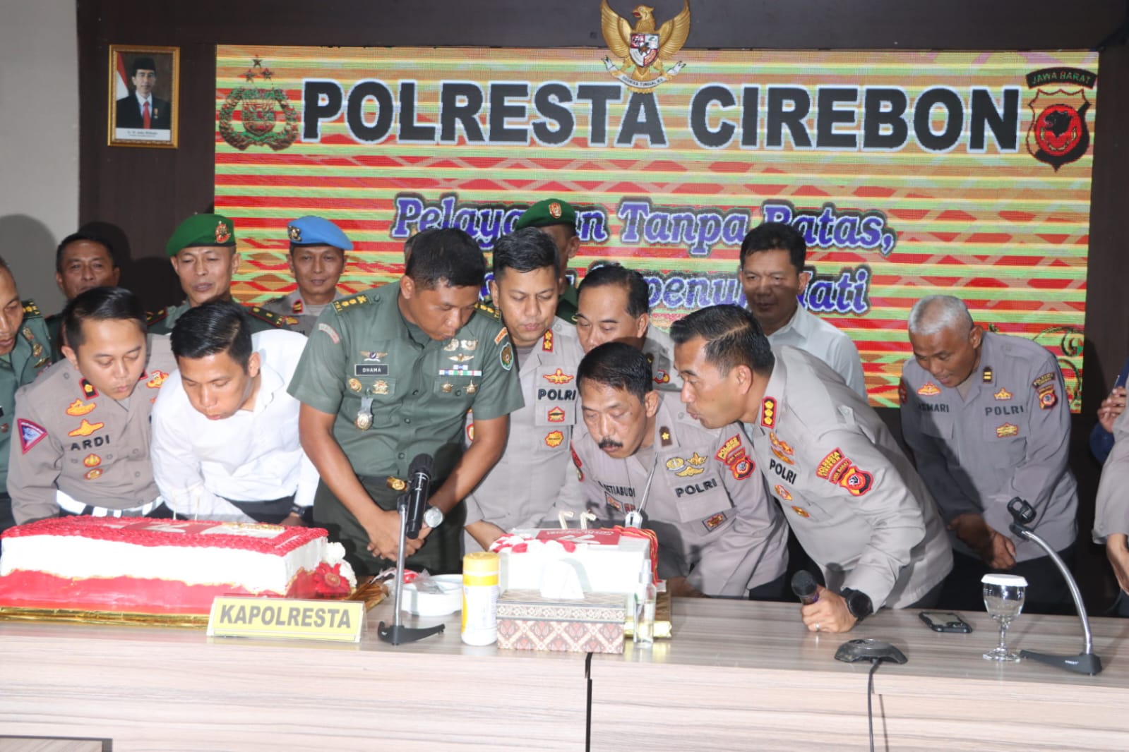jejakkasus.co.id, CIREBON – Jajaran Korem 063/SGJ dan Kodim 0620/Kabupaten Cirebon serta KPAID Kabupaten Cirebon memberikan kejutan Hari Bhayangkara ke-77 kepada Kapolresta Cirebon Kombes Pol. Arif Budiman, S.I.K., M.H., bertempat di Mapolresta Cirebon, Polda Jawa Barat (Jabar), Senin (3/7/2023).