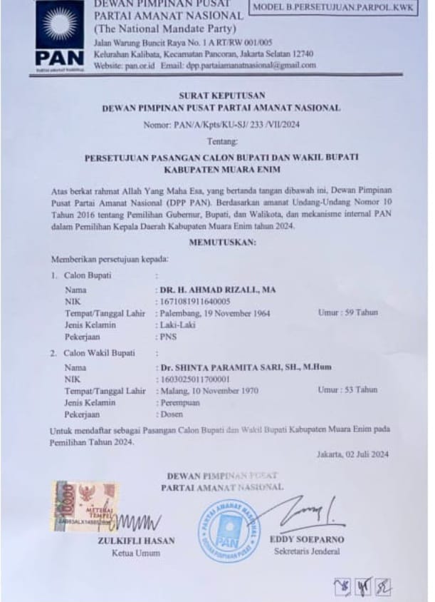 Melalui surat keputusan dengan Nomor PAN/A/Kpts/KU-SJ/233/VII/2024 yang diterbitkan DPP PAN pada 02 Juli 2024 dan ditandatangani oleh Ketua Umum DPP PAN Zulkipli Hasan dan Sekjen DPP PAN Eddy Soeparno, tertulis terkait keputusan DPP PAN tentang Persetujuan pasangan Kepada DR.H.Ahmad Rizali, M.A., sebagai Calon Bupati Muara Enim periode 2024-2029, dan Dr.Hj. Shinta Paramita Sari, S.H., M.Hum., sebagai Bakal Calon Wakil Bupati Muara Enim Periode 2024-2029.