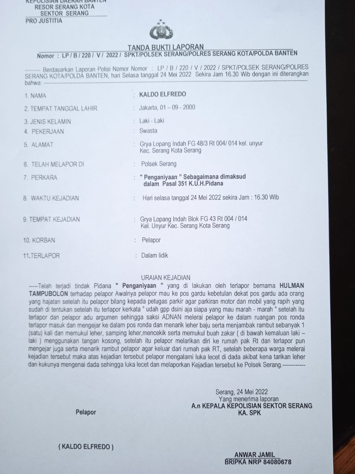 jejakkasus.co.id, BANTEN – Diduga melakukan penganiayaan terhadap pemuda belia secara brutal, seorang pria bertubuh besar di Desa Griya Lopang Indah, Kota Serang, Banten, berurusan dengan Kepolisian, Jumat (24/6/2022).