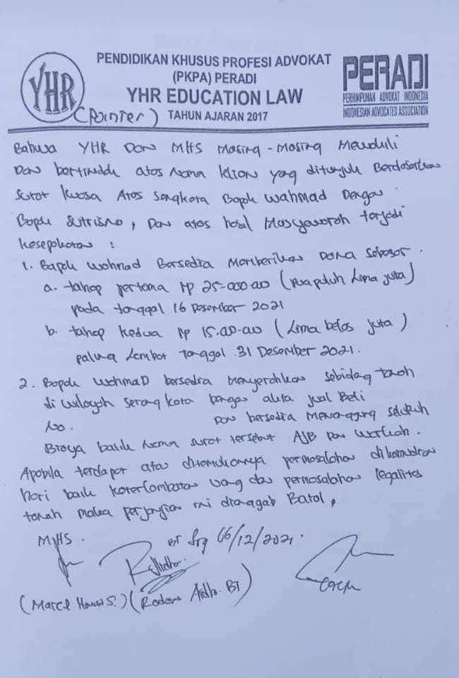 Setelah survei dan deal, WK langsung menyerahkan Surat-surat Tanah berupa Akte Jual Beli atas nama sendiri tanggal 05 Desember 2021, dan uang kompensasi sebesar Rp 40 juta sesuai permintaan kuasa hukum STR, juga disanggupi oleh Terlapor WK dengan 2 kali pembayaran.