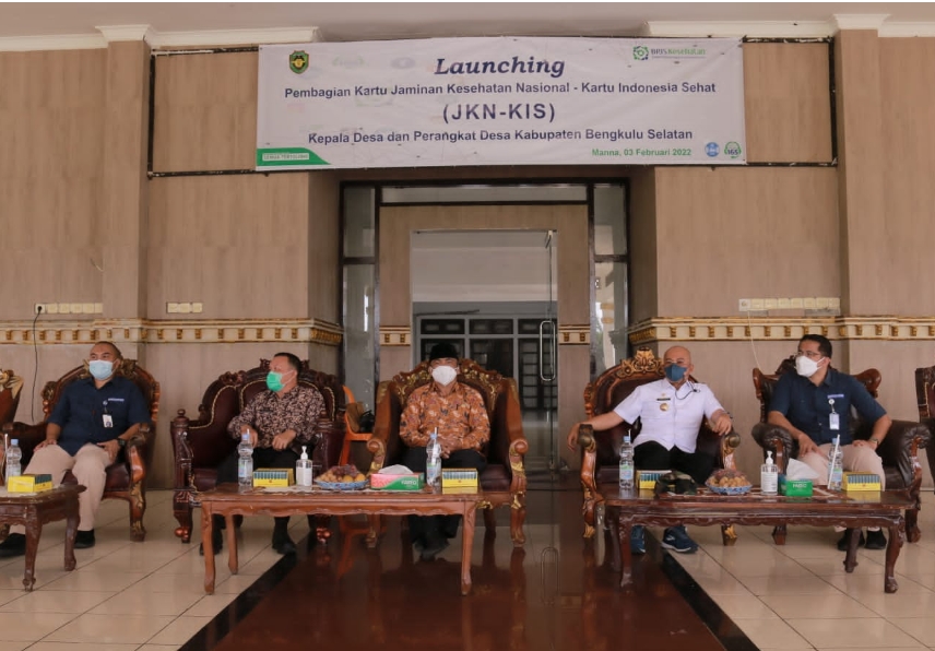 jejakkasus.co.id, BENGKULU SELATAN – Bupati Bengkulu Selatan Gusnan Mulyadi menghadiri launching sekaligus membagikan langsung secara simbolik Kartu Jaminan Kesehatan Nasional- Kartu Indonesia Sehat (JKN- KIS) untuk Kepala Desa (Kades) dan Perangkat Desa bertempat di Balai Sekundang Manna, Kabupaten Bengkulu Selatan, Provinsi Bengkulu, Kamis (3/2/2022).