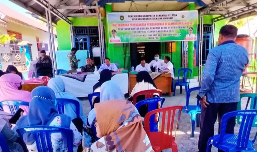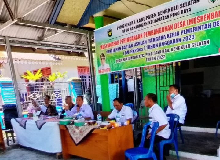 jejakkasus.co.id, BENGKULU SELATAN – Pemerintah desa (Pemdes) Nanjungan menggelar rapat Musyawarah Perencanaan Pembangunan (Musrenbang) Desa Tahun Anggaran 2023, terkait Pra Pelaksanaan Peningkatan Infrastruktur/Fisik dan Perekonomian Desa, bertempat di Kantor Desa Nanjungan, Kecamatan Pino Raya, Kabupaten Bengkulu Selatan, Provinsi Bengkulu, Rabu (05/01/2022).