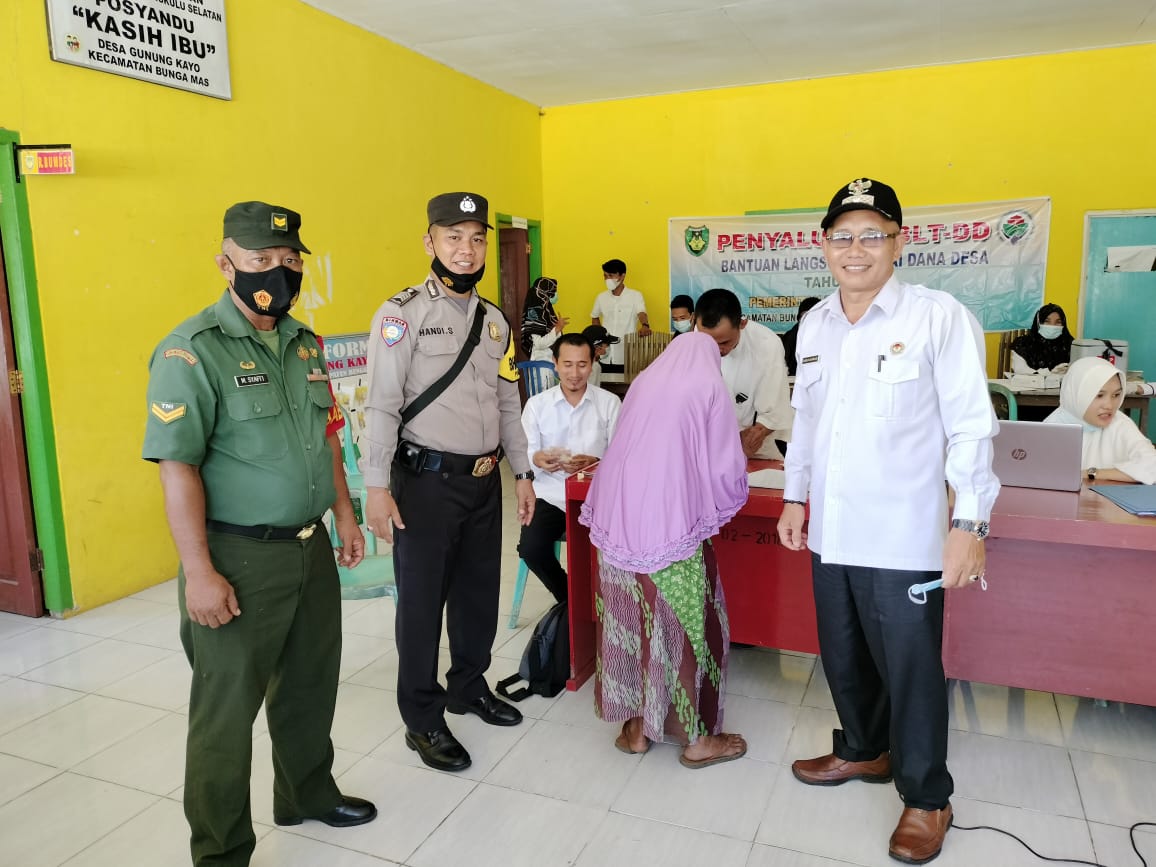 Penyaluran BLT DD dihadiri Bhabinkhamtibmas Handi septanto, Babinsa Sulaiman, Kepala Desa Gunung Kayo Riskan Hamdani juga masyarakat penerima manfaat, yakni 73 Keluarga Penerima Manfaat (KPM).