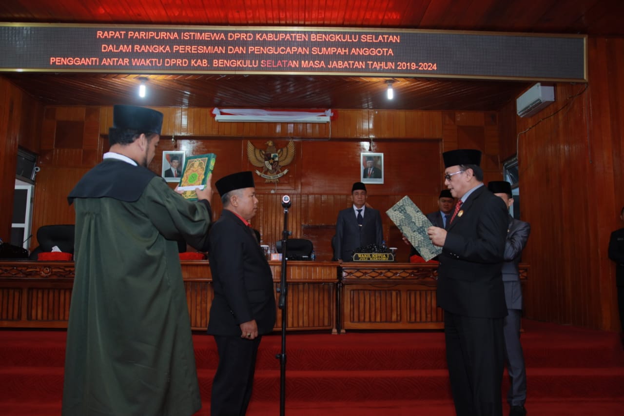 Imron Amin Yunus yang baru dilantik akan menjalankan tugas dan fungsi sebagai anggota DPRD Kabupaten Bengkulu Selatan sisa Masa Bakti periode 2019-2024. (Zrk/Red)