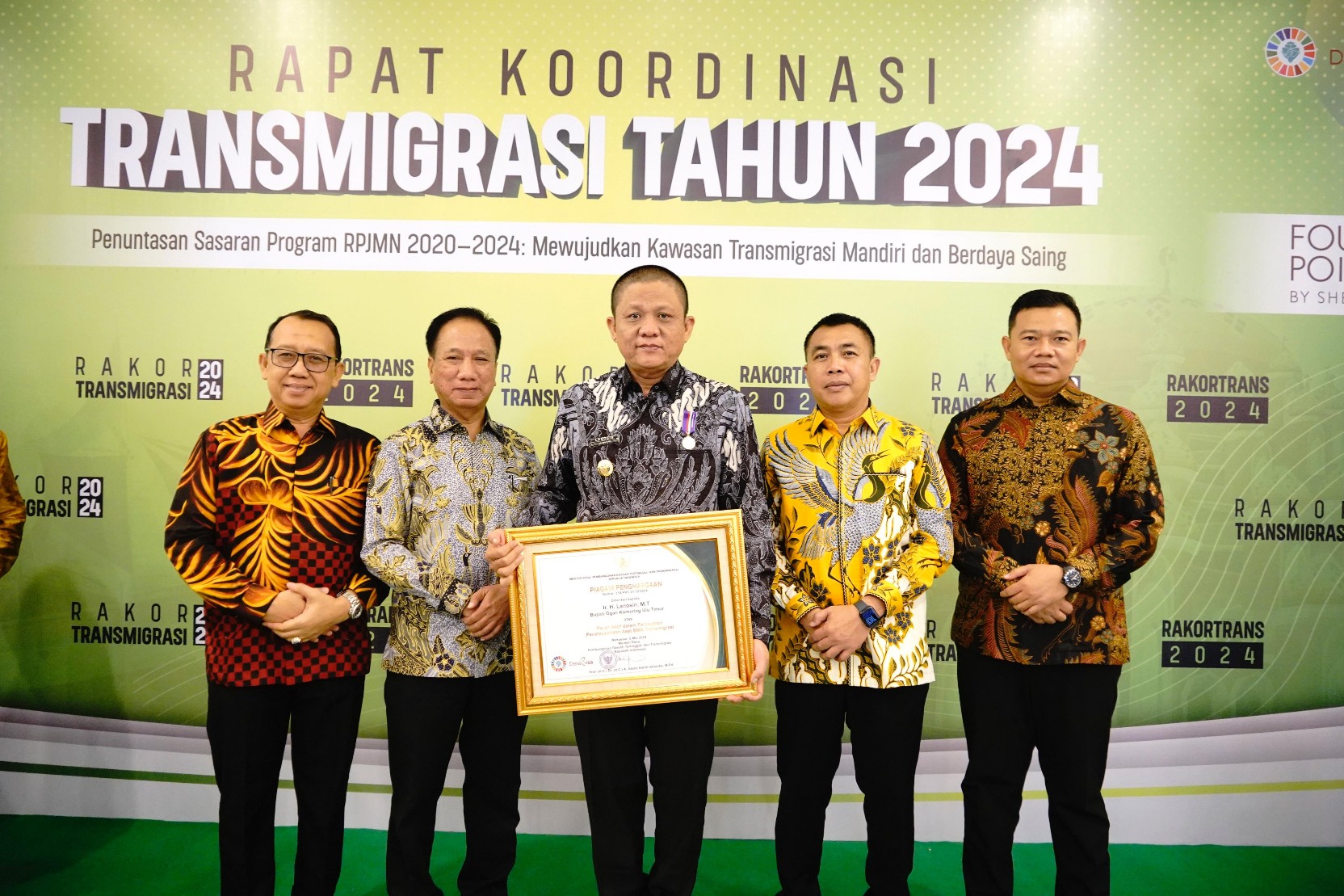Lencana Bakti Transmigrasi ini dipasangkan langsung oleh Menteri Desa, Pembangunan Daerah Tertinggal dan Transmigrasi Prof. Dr. A. Abdul Halim Iskandar, M.Pd., kepada Bupati OKU Timur Ir. H. Lanosin, M.T., disela-sela Rapat Koordinasi Transmigrasi Tahun 2024 di Ballroom Hotel Four Points by Sheraton Makassar Sulawesi Selatan.