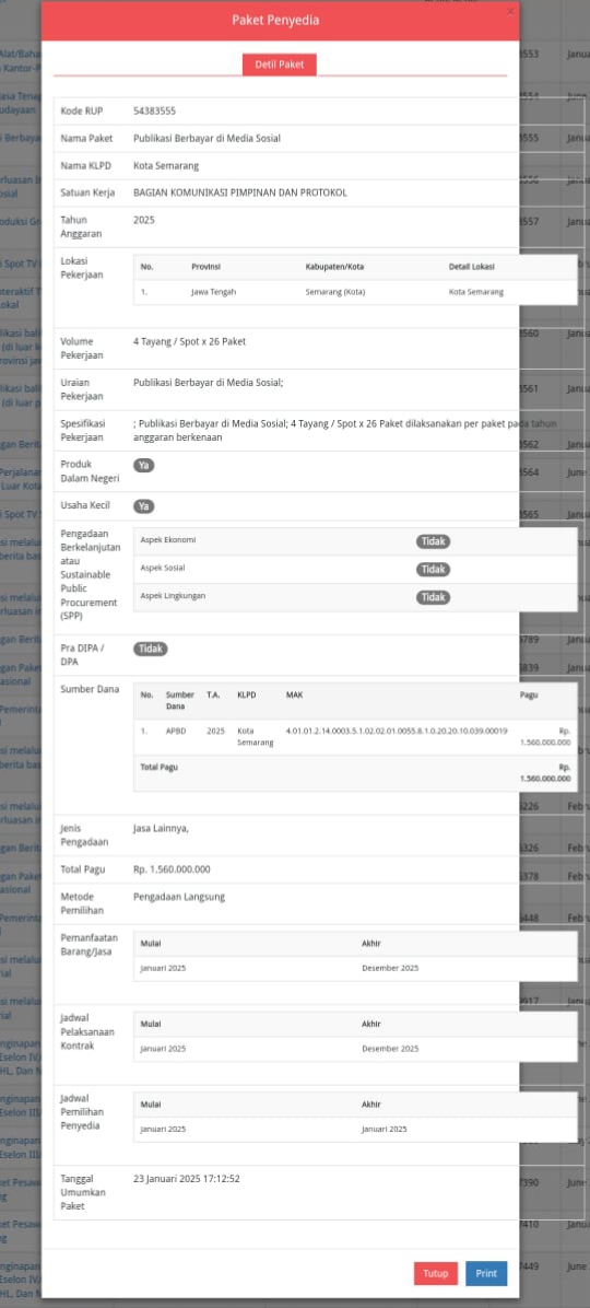 – Jasa publikasi baliho/billboard promosi di luar provinsi Jateng Rp400 juta (pengadaan langsung)