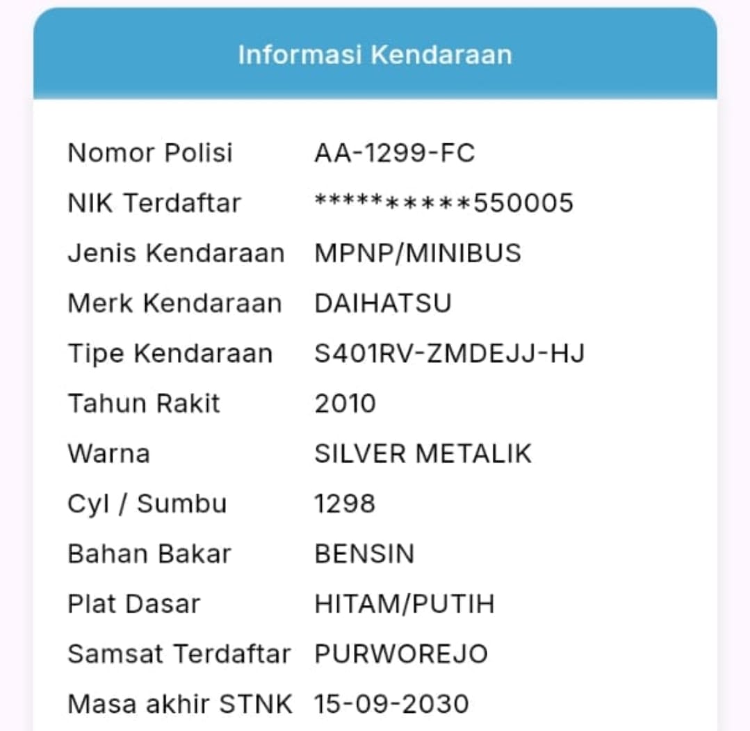 Kecurigaan semakin menguat setelah dilakukan pengecekan melalui aplikasi Sakpol Jateng. Hasilnya, Nopol AA 1282 BK tercatat milik Daihatsu Sigra, sedangkan AA 1299 FC milik Daihatsu Gran Max.