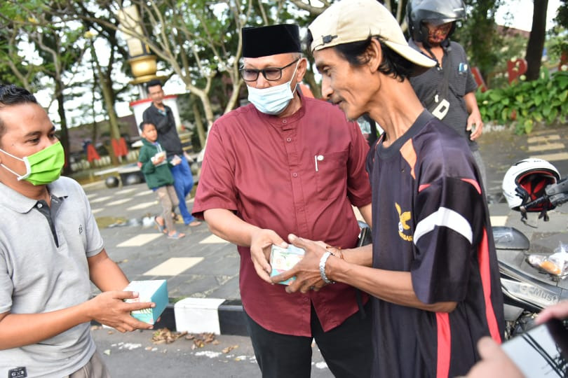 Bupati Acep tampak telaten membagikan Takjil kepada pengendara dan masyarakat yang melintas.
