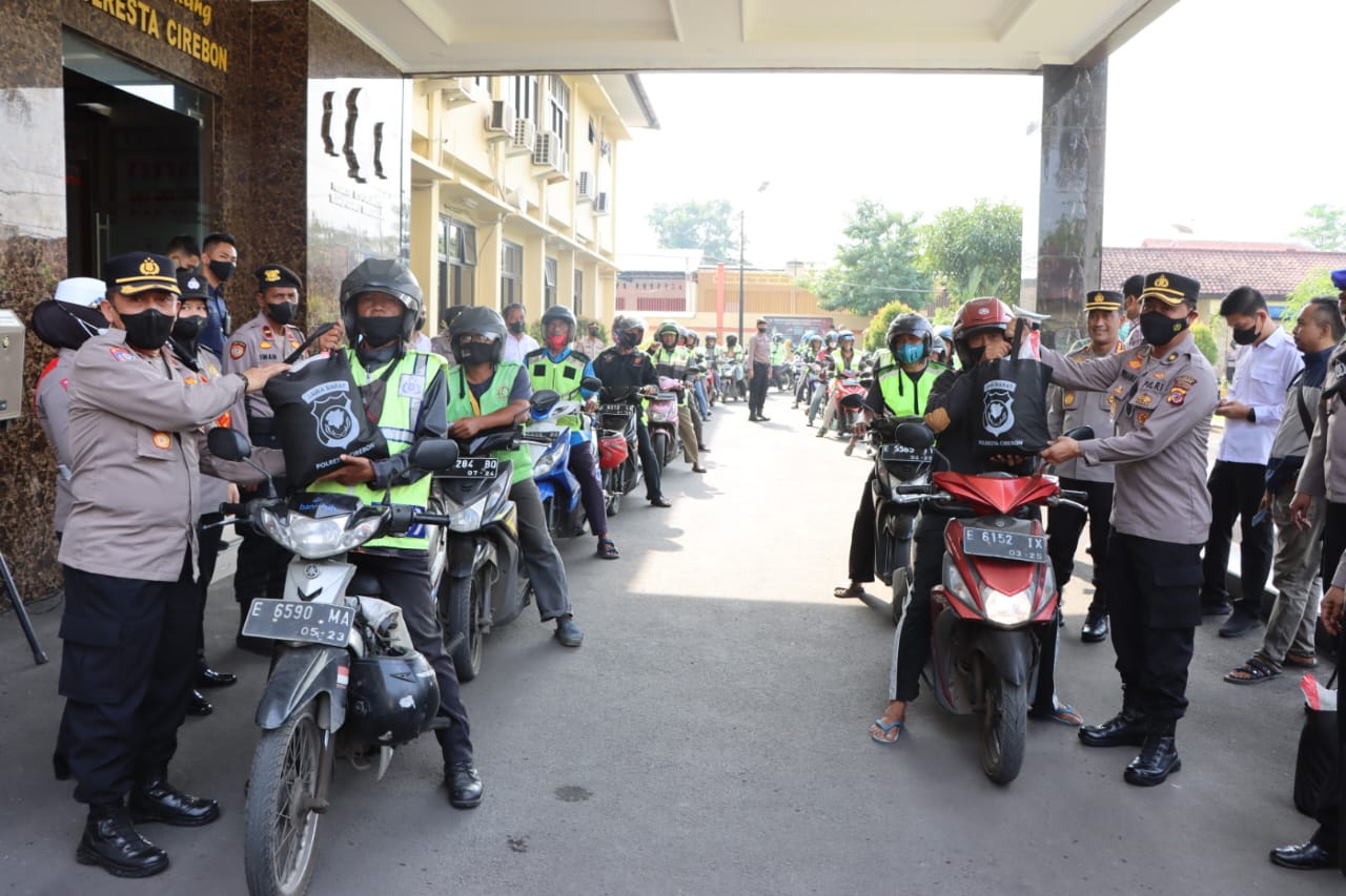 Para Tukang Becak, Ojek Online, Ojek Pangkalan dan lainnya, mendatangi Mapolresta Cirebon, kemudian diberikan Bansos satu per satu langsung di atas kendaraannya.