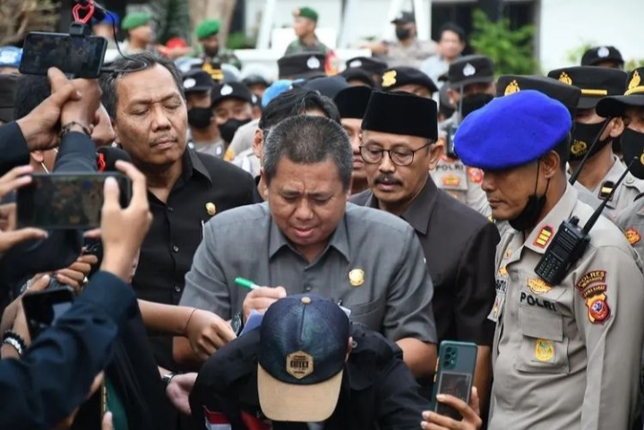 Selanjutnya, Syaefudin bersama Pimpinan Fraksi yang hadir menemui peserta Aksi Damai menandatangani tuntutan Mahasiswa sebagai bentuk penolakan dari DPRD Indramayu kepada Pemerintah Pusat. (Ron/Red)