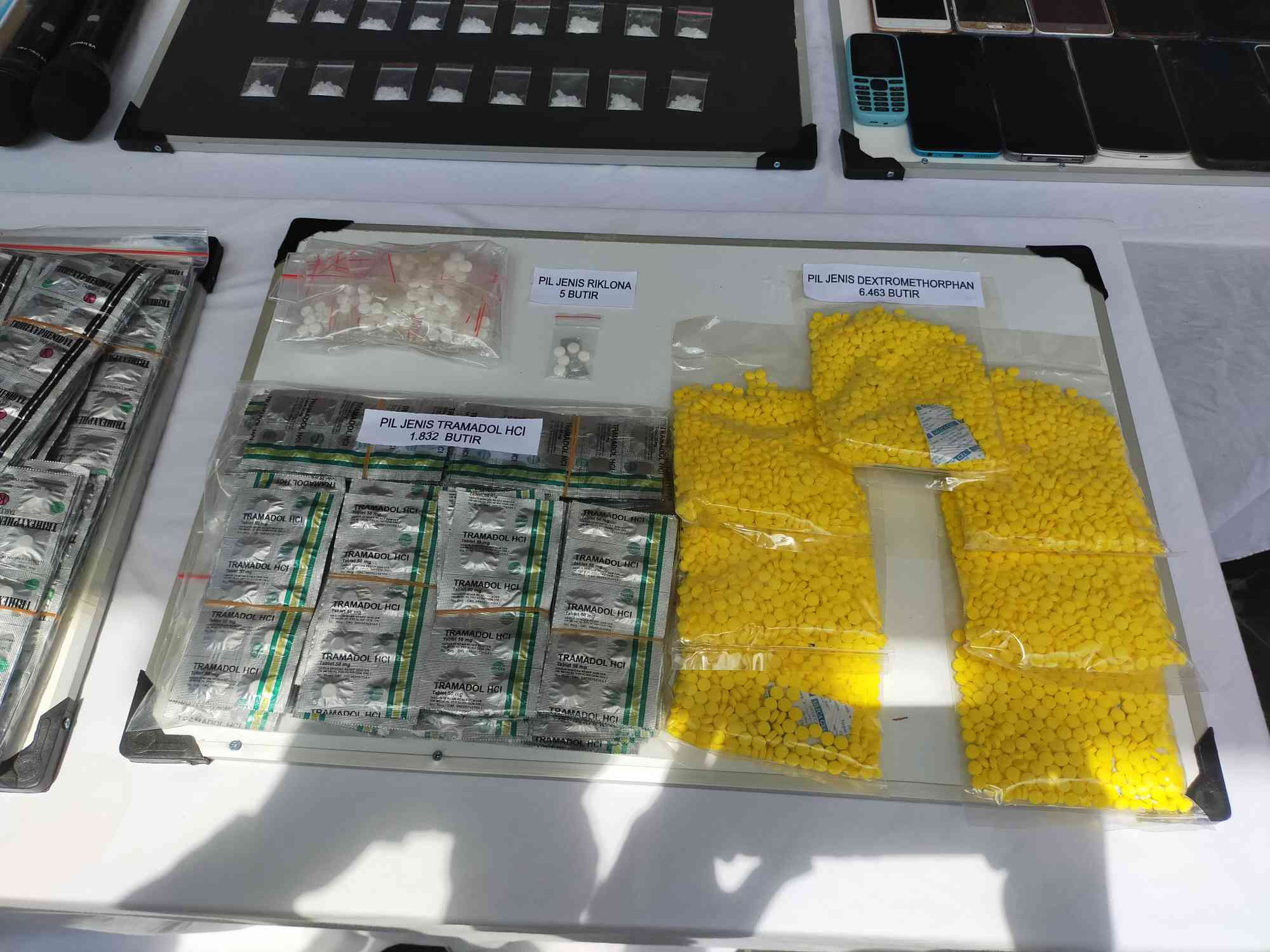 Lanjut Kapolres, selain itu berhasil juga diamankan Barang Bukti (BB) berupa Obat-obatan yang terdiri dari Tramadol sebanyak 1832 butir, Trihexyphenedyl sebanyak 4180 butir, Dextromethorphan sebanyak 6483 butir, 5 butir psikotropika jenis Riklona dan uang tunai sebesar Rp 10 juta berikut dengan alat komunikasi handphone yang dipakai para Tersangka.