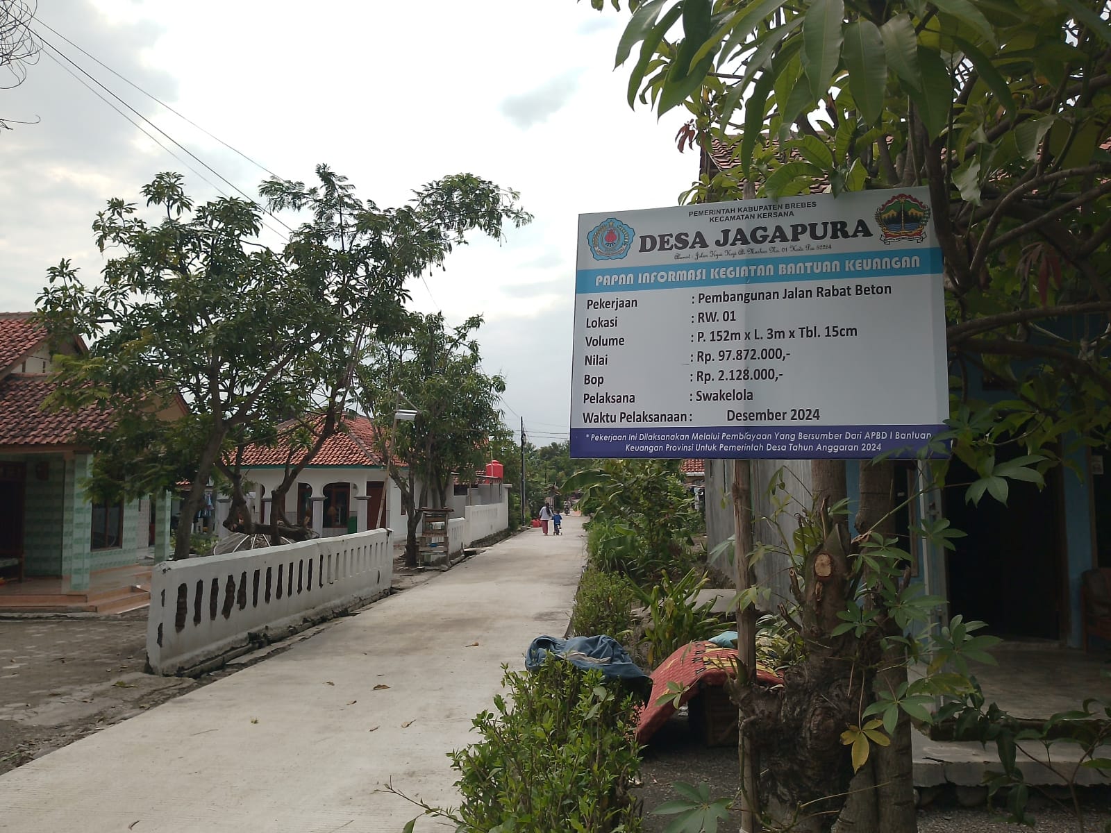 jejakkasus,co,id, BREBES – Pemerintah Desa (Pemdes) Jagapura, Kecamatan Kersana, Kabupaten Brebes, Jawa Tengah (Jateng) mendapatkan Bantuan Keuangan (Bankeu) dari Provinsi Tahun Anggaran 2024 akhir dengan nilai sebesar Rp 97,872,000,-, BOP Rp 2,128,000,- dengan volume panjang 152 m, lebar 3 m, tebal 15 cm.