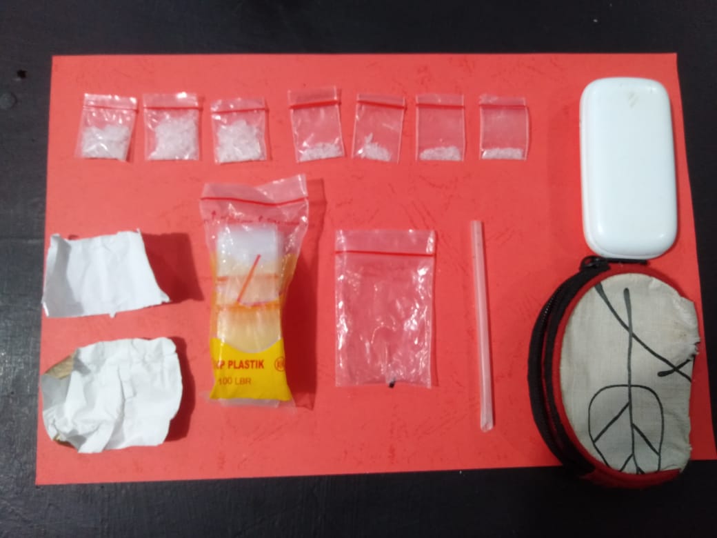 Dari Terduga PJ yang juga mantan Tenaga Honorer itu, petugas menyita Barang Bukti berupa 7 (tujuh) buah Plastik Klip Bening berisi Kristal Putih diduga Narkotika Golongan 1 jenis Sabu, 1 (satu) buah Centong dari Pipet Plastik, 1 (satu) Unit Handphone merk Samsung dan beberapa barang lainnya.