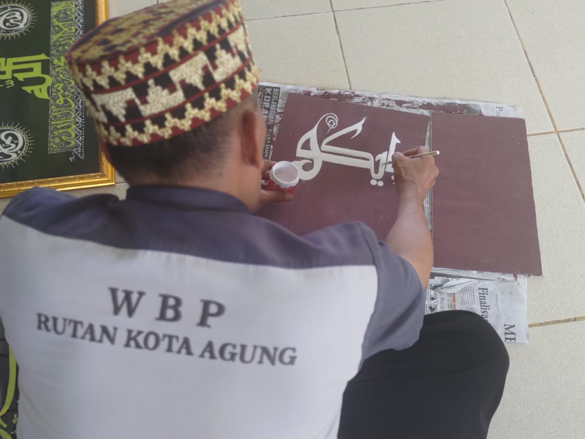 Foto: HN (53) saat membuat seni kaligrafi di Rutan Kota Agung, Kabupaten Tanggamus, Lampung, Senin (1/8/2022).