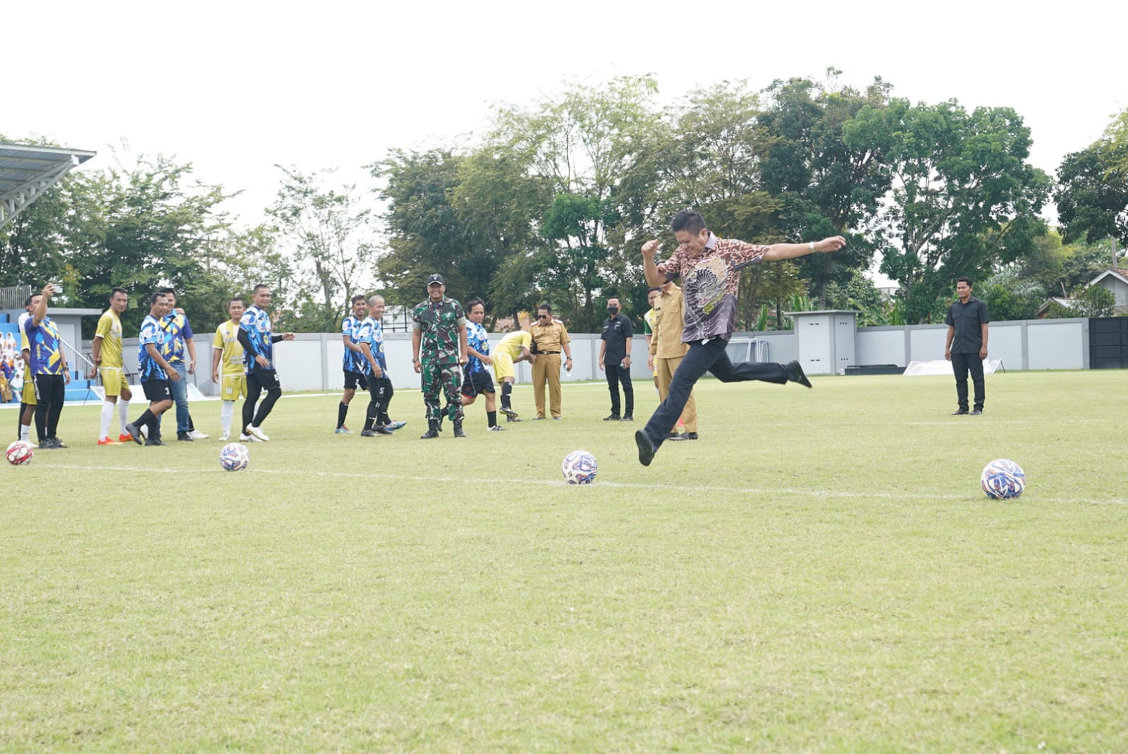 Acara pembukaan dilanjutkan dengan penyerahan bantuan Bola secara simbolis kepada Klub-Klub di OKU Timur, kemudian dilakukan Tendangan Bola pertama (Kick Off) oleh Bupati Enos diikuti Wabup Yudha dan Forkopimda. (Yoga/Red)