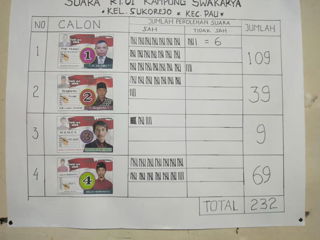 Untuk diketahui, pemilihan Ketua RT 001, RW 001 diikuti empat calon, yakni A. Husin Nomor Urut 1, Sugianto Nomor Urut 2, Selamet Riyadi Nomor Urut 3, Selvi Hermanto Nomor Urut 4.