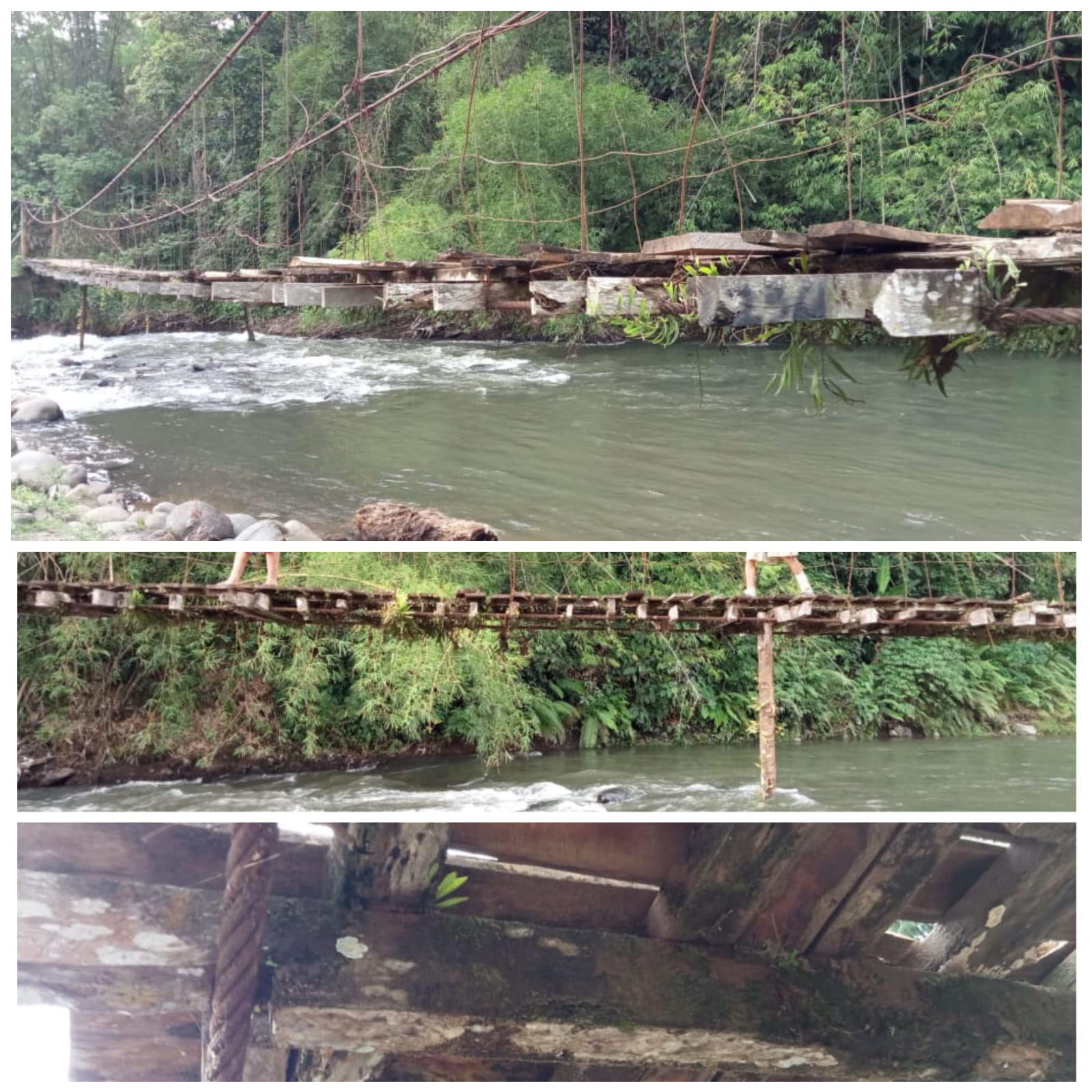 “Apabila melewati Jembatan Gantung tersebut, kami harus berhati-hati, kalau tidak, akan berakibat fatal, dikarenakan bahan material Jembatan tersebut sudah sangat rapuh, dan Jembatan sudah sangat goyang sekali, ditambah bila melewati Jembatan tersebut harus antrian, dikarenakan takut Jembatan Gantung itu ambruk,” jelas Holip.