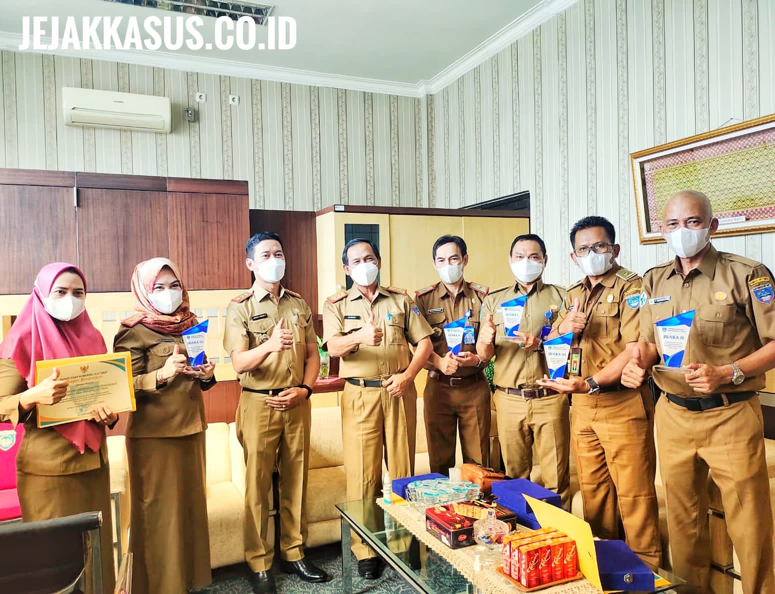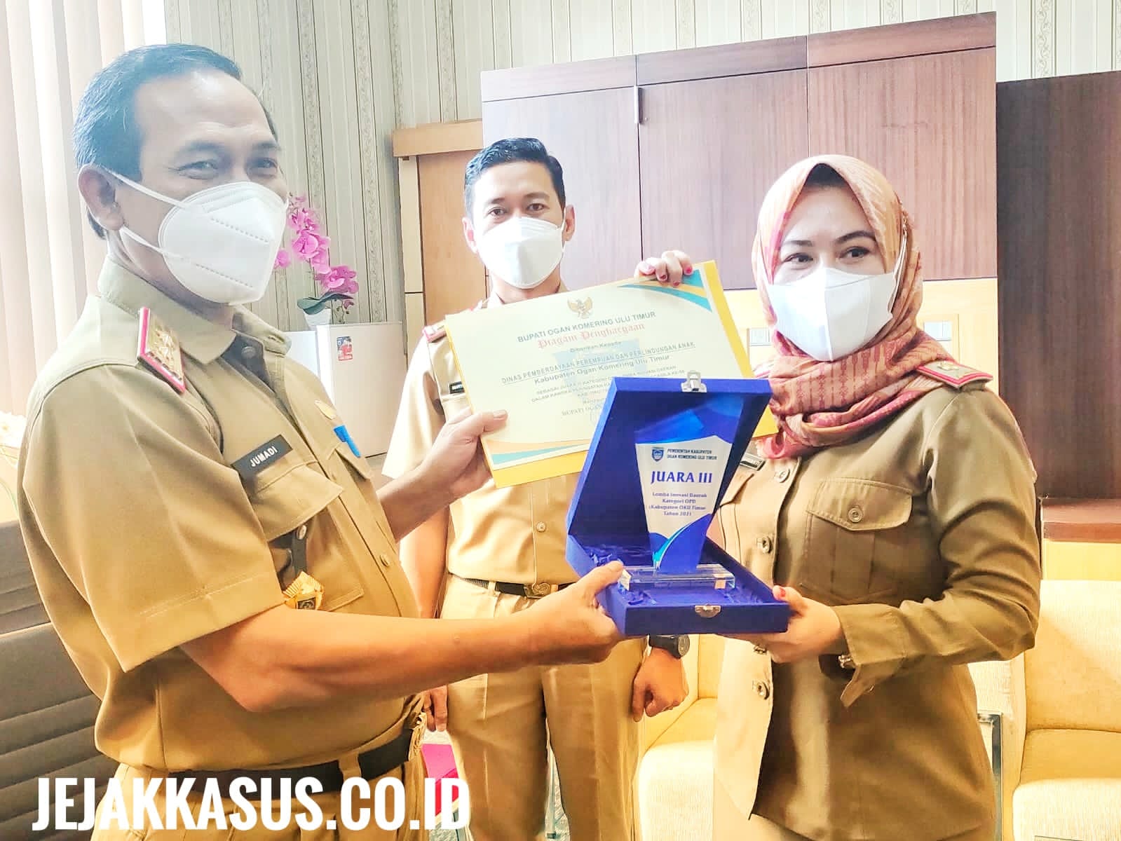Kepala Dinas Komunikasi dan Informatika Arfan Hermawan, S.T., M.M., menerima langsung penghargaan yang diserahkan oleh Sekretaris Daerah Kabupaten OKU Timur.