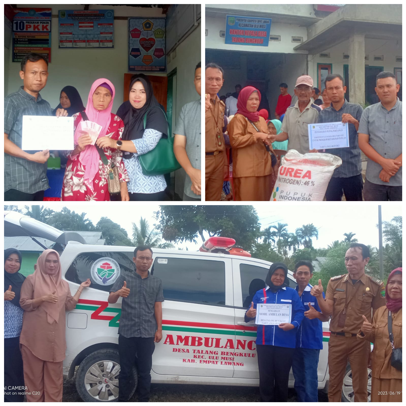 Kemudian, Kepala Desa Talang Bengkulu Rosdiana melanjutkan penyerahan satu Unit Mobil Ambulance sebagai fasilitas tranportasi, baik dalam keadaan Gawat Darurat maupun pelayanan kesehatan.