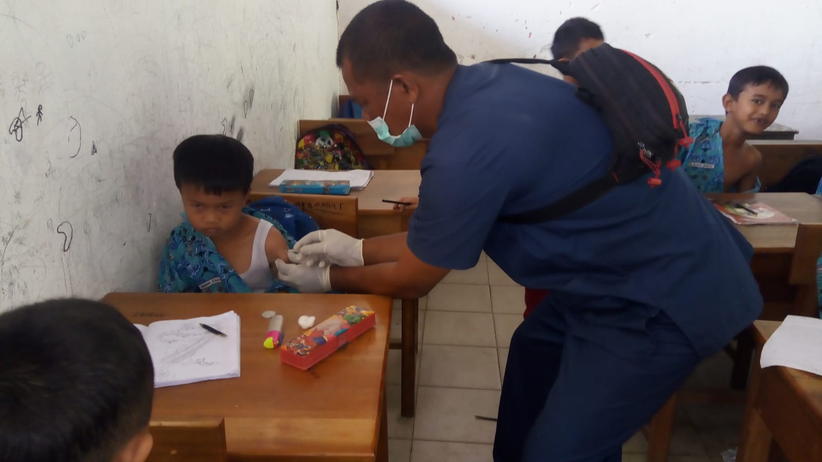 Satu demi satu Siswa Siswi Kelas 1 mendapatkan Suntikan Vaksin Campak dari Tim BIAN Puskesmas Tanjung Sakti Pumu.