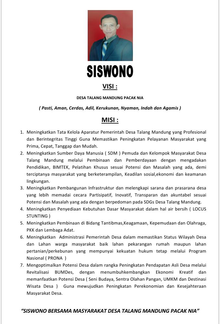 Disinggung soal makna dari Visi Misi dengan slogan “Siswono Bersama Masyarakat Desa Talang Mandung PACAK NIA” dijelaskan secara singkat, bahwa “PACAK NIA” merupakan kepanjangan dari Pasti, Aman, Cerdas, Kerukunan, Nyaman, Indah dan Agamis.